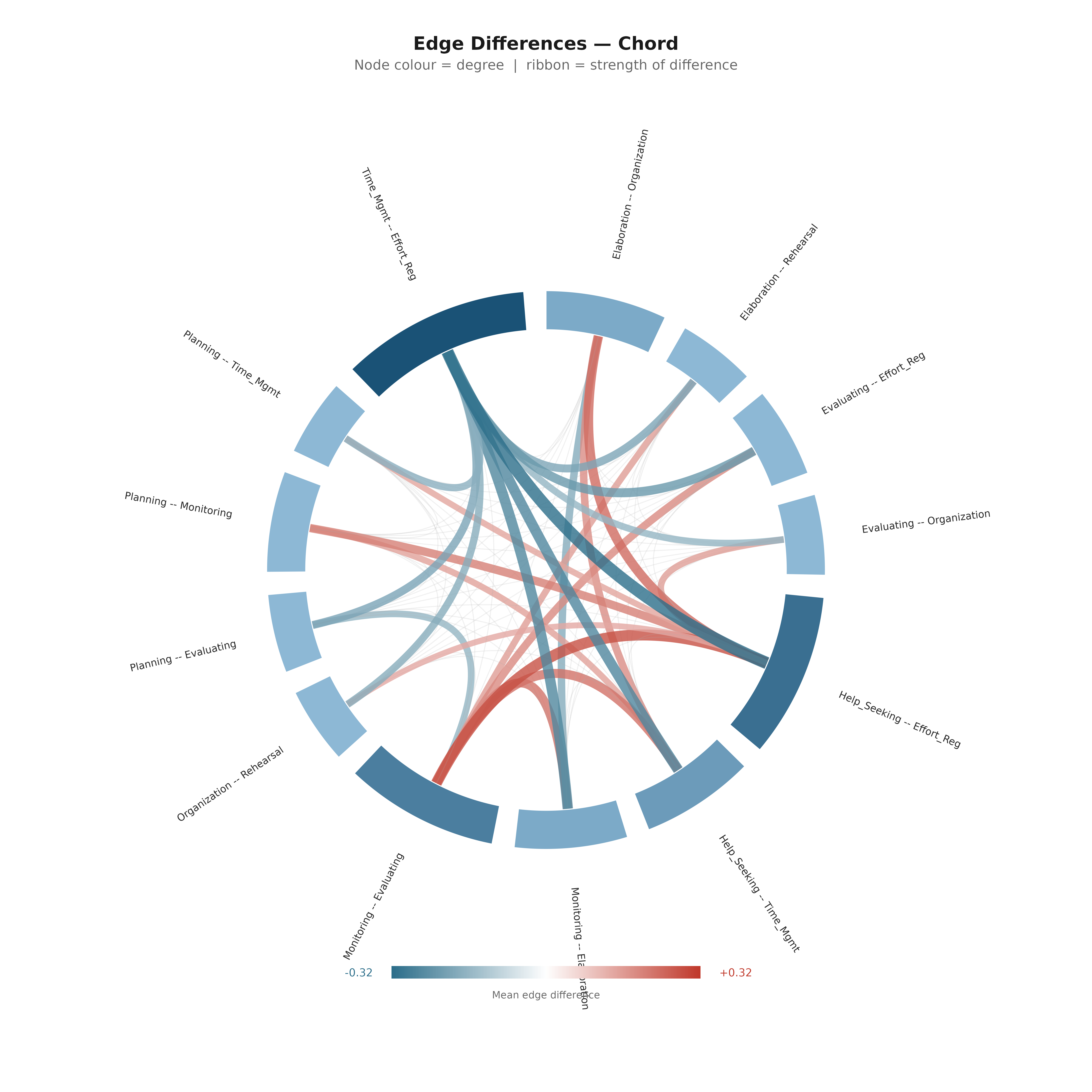 subtitle = "Node colour = degree | ribbon = strength of difference")