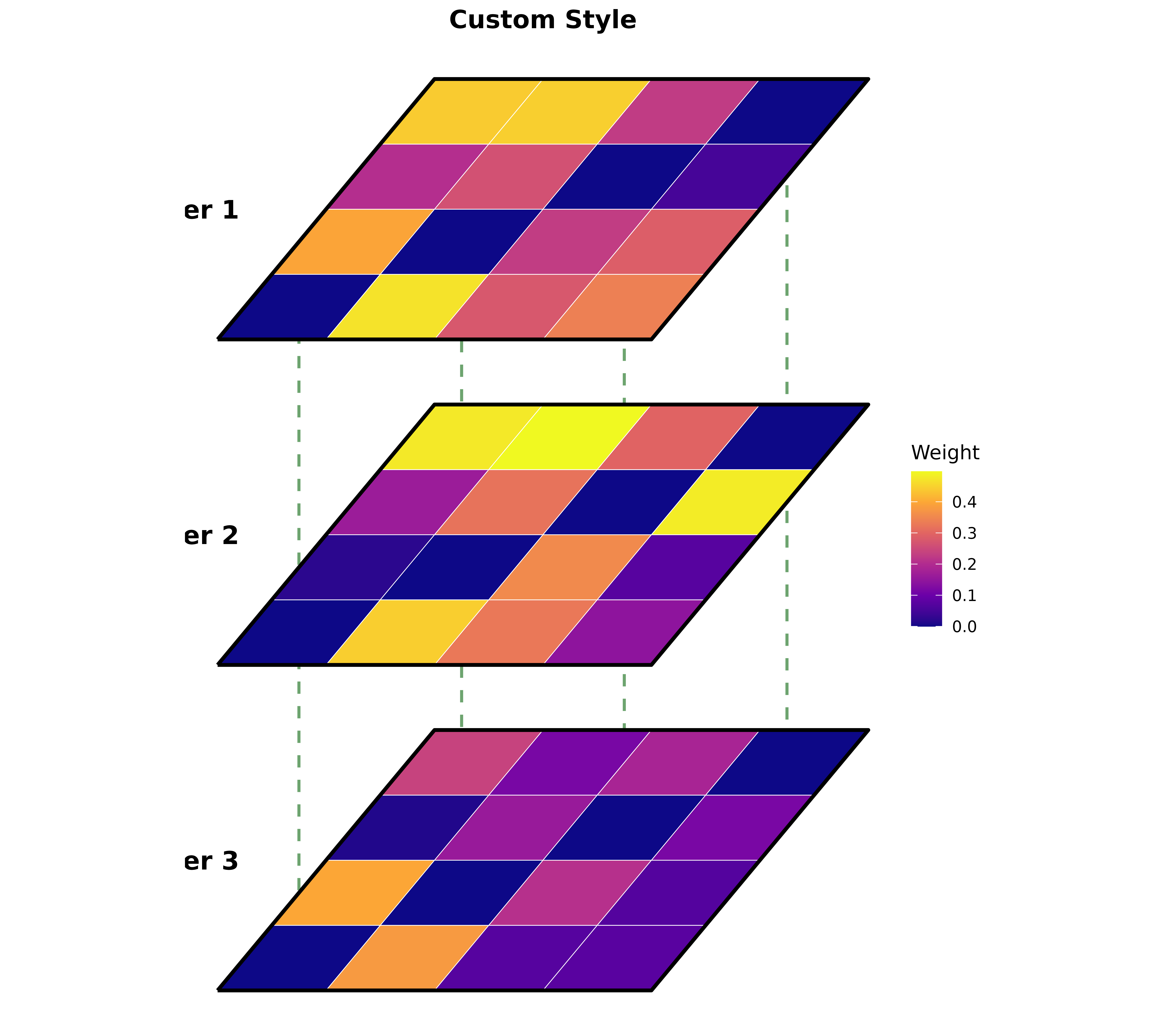 3D perspective heatmaps with inter-layer connections.