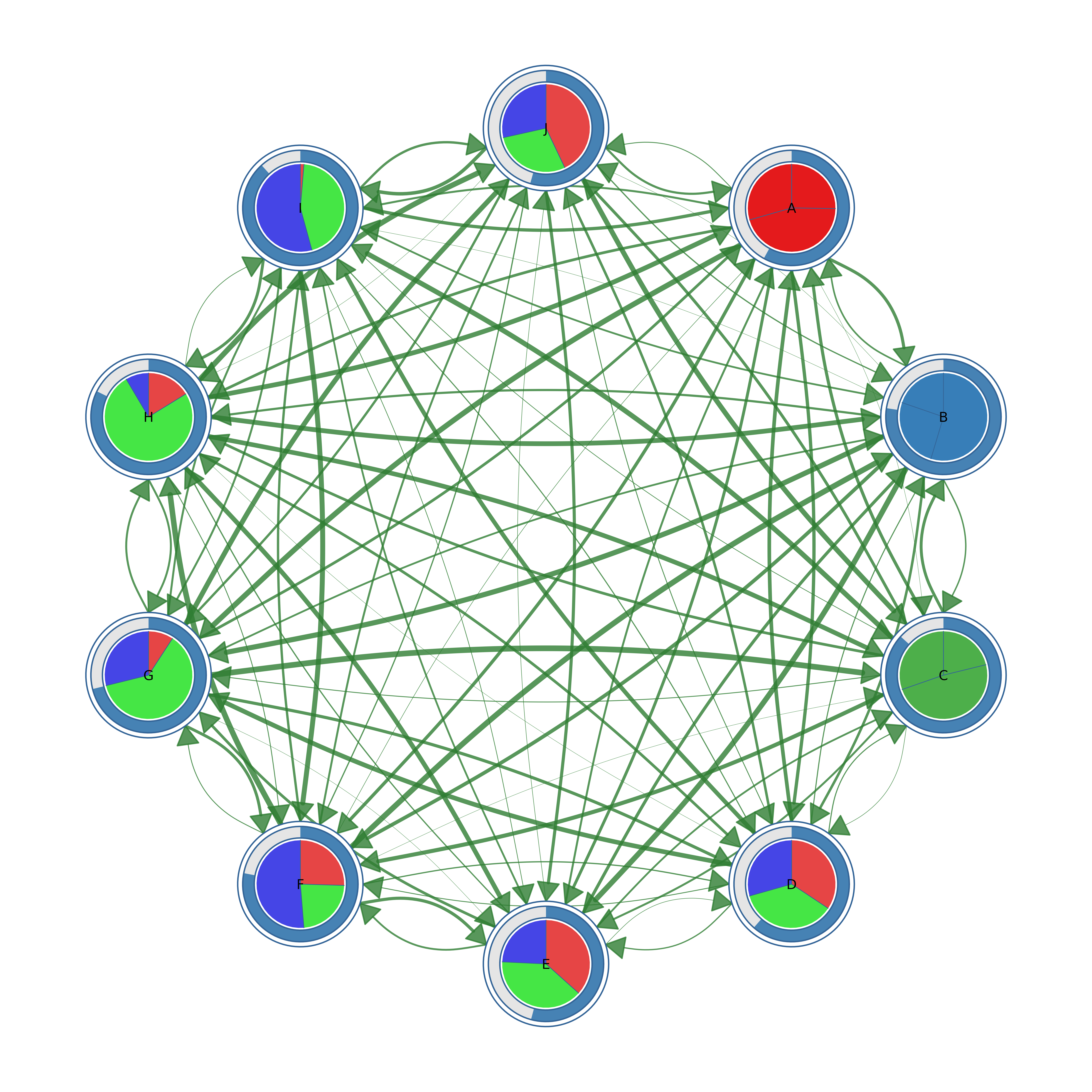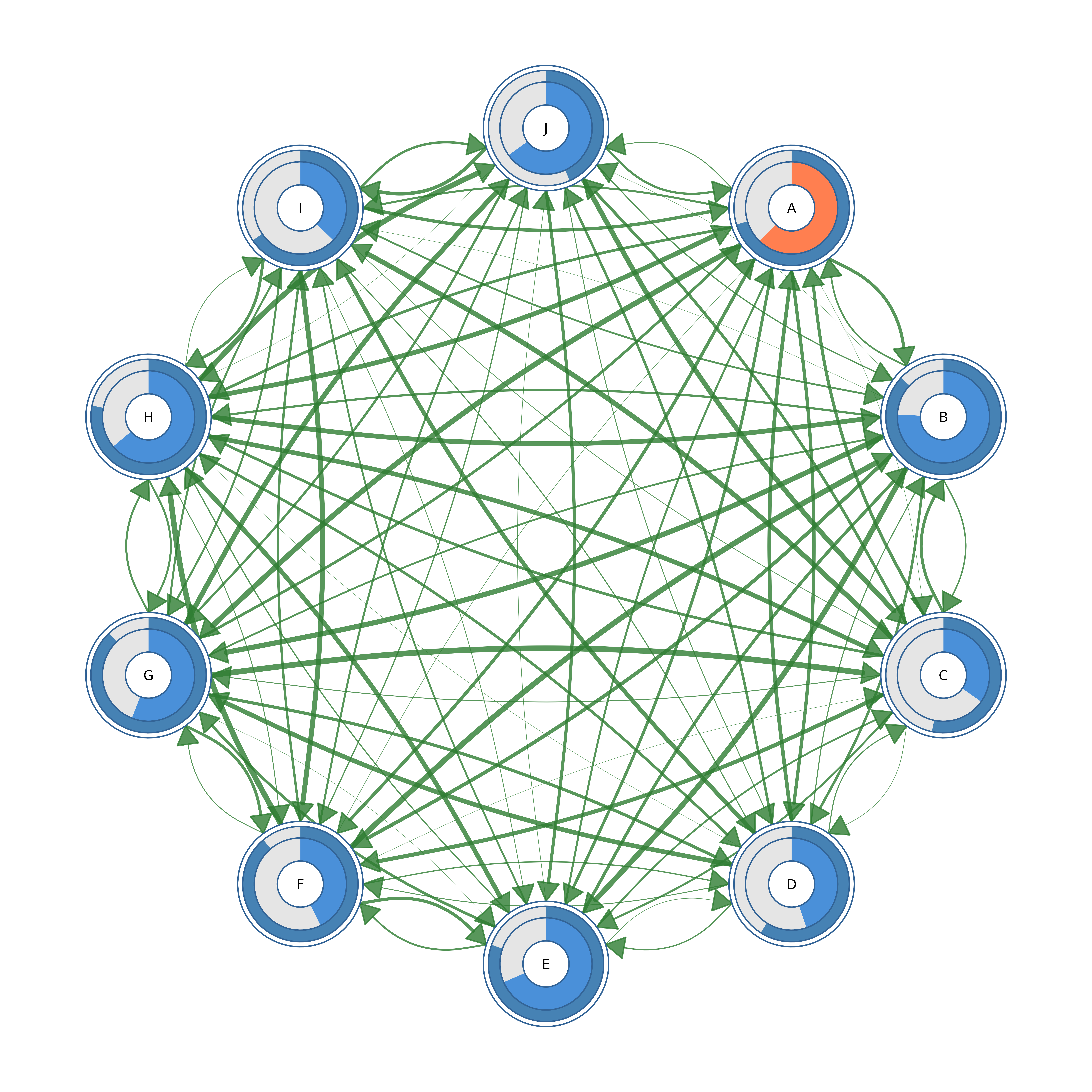 Nested progress rings showing two metrics per node.