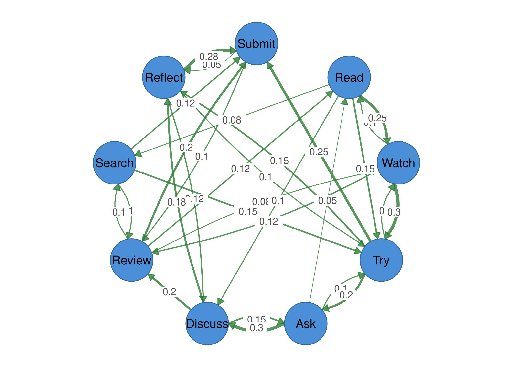 We use a simulated Markov transition matrix representing student learning behavior transitions across nine states.