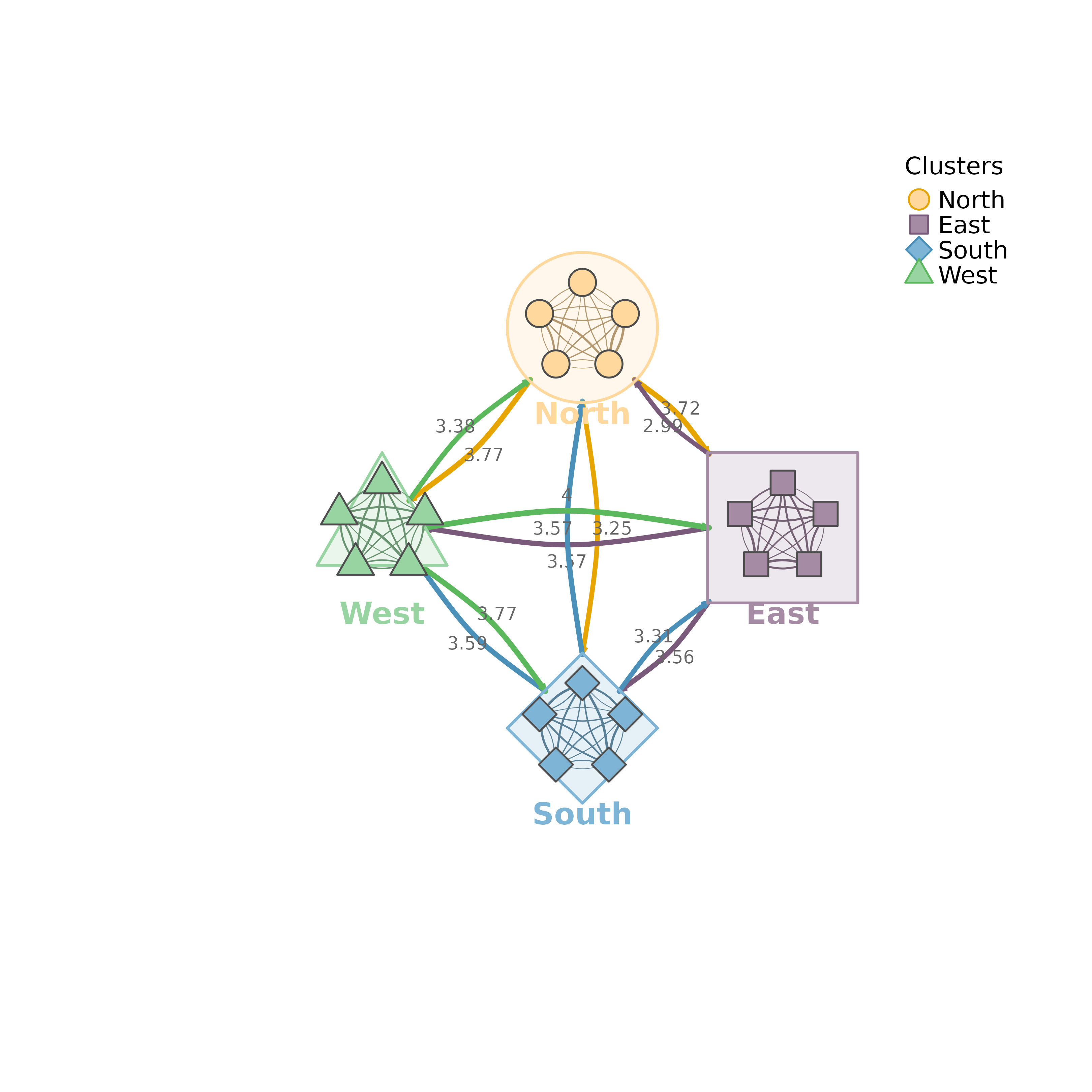 Visualizes multiple network clusters with summary edges between clusters and individual edges within clusters. Each cluster is displayed as a shape (circle, square, diamond, triangle) containing its nodes.